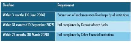 The circular sets the following (fixed) compliance timelines from the date the CBN Baseline Standards were issued: